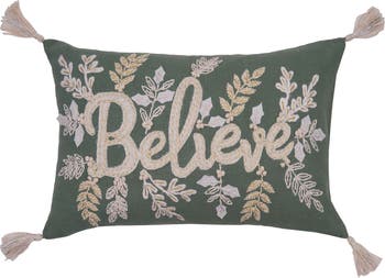 The beautifully embroidered Believe Pillow brings a touch of inspiration to any space. Centered in a flourishing text, the word Believe stands out boldly against the soft sage fabric, surrounded by delicate foliage and stems that add a natural elegance. The intricate embroidery showcases a harmonious blend of white and natural tones, enhancing the pillow’s enchanting design. With its charming details and inviting texture, this pillow is perfect for adding a heartfelt touch to holiday decor, encouraging the spirit of the season when displayed on a couch or reading nook.