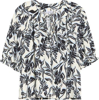 Soft gathering at the collar gives an airy feel to this three-quarter sleeve top with a subtle tie at the neck.