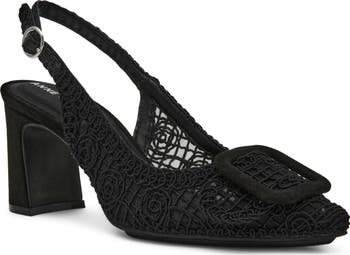 Floral embroidered mesh brings romantic texture to this slingback pump detailed with a fabric-covered buckle and lifted by a wrapped block heel.