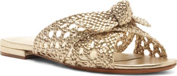A metallic finish highlights the intricately woven design of this flat slide sandal topped with bow for a signature Birman flourish.