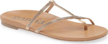 Swarovski crystals add extra glamour to the asymmetric straps of this metallic lambskin leather sandal that's both effortless and understated.
