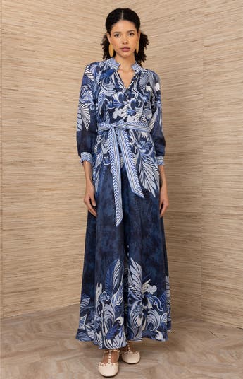 A flowing maxi dress with a soft leaf print, split neckline, and self-tie waist for an effortlessly flattering fit.