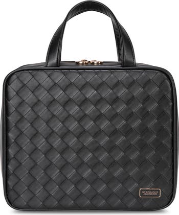 This roomy cosmetics case features a briefcase-inspired design that features top-carry handles and four removable compartments.