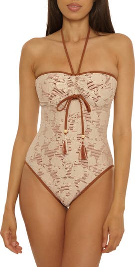 A lacy overlay creates a boho, crochet-inspired look for this one-piece outlined in contrast binding and made with optional halter ties.