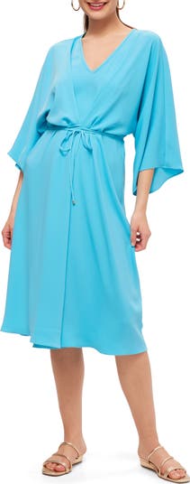 Kimono sleeve midi dress with a V neckline and spaghetti tie belt
