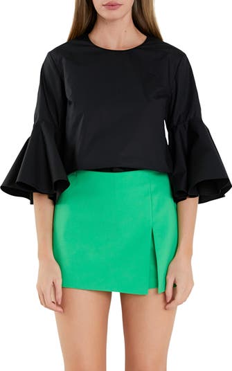 Fluttery bell sleeves amplify the retro appeal of a charming cotton top fashioned in a comfortably relaxed fit.