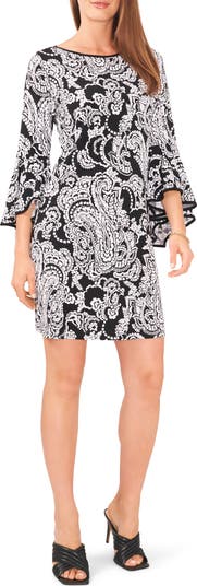 A swirling paisley print emboldens this day-to-night dress framed by flouncy bell cuffs.