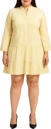 Brighten any social occasion in this charming dress styled with airy eyelet embroidery, bell sleeves and a flowy tiered hem.