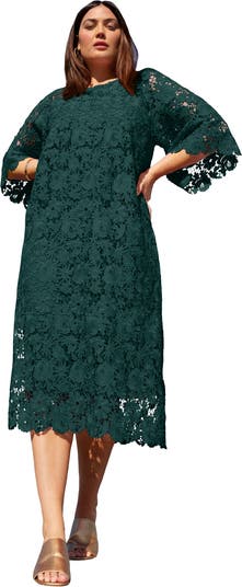 Feel fabulously feminine in this funky floral lace dress. With a simple scoopneck, this delicate midi dress features a detachable lining for easy wear. A straight silhouette balances the midi's bell sleeves, making for a versatile dress ready for any occasion.