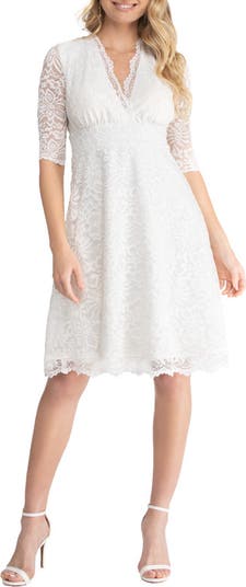The Bella Lace A-Line Cocktail Dress is designed with elegant stretch scalloped lace, lined bodice and A-line skirt, and 3/4 length sleeves. Comes in a slightly off-white ivory hue. Perfect for showers, graduations and special occasion parties. Available in regular and plus sizes.