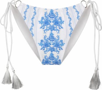 Bella is a delicate string bikini featuring a soft pastel blue pattern designed to highlight a golden glow. Defined by its minimalist silhouette, the design is elevated with stretchy ties and charming tassel ends for a whimsical touch.