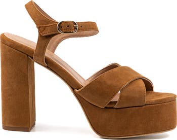 Crafted from suede, this platform sandal features a walkable block heel and a buckled ankle strap for a luxurious style