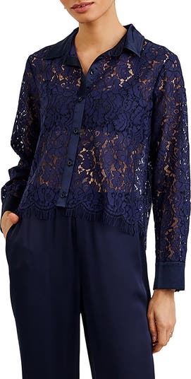 Lacy blooms and glossy satin define a semisheer shirt finished in a fringe for a look that works for fun or fancy.