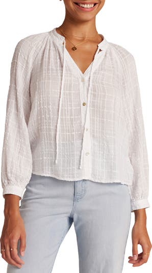 This gauzy cotton-kissed shirt features faint checks and slender neck ties.