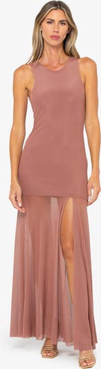 The Bella Dress in Mauve is an elegant, layered silhouette designed to move beautifully with the body. It features a sleek sleeveless bodice with a high neckline and a softly fitted shape, flowing into a sheer mesh skirt with a fluid drape and subtle front slit. Lined with lightweight jersey for comfort and coverage, the Bella Dress balances softness and structure for a refined, romantic look.