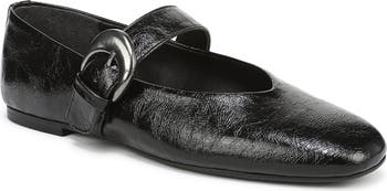 A glossy patent finish brings modern sophistication to a classic round-toe flat topped with a mary jane strap.