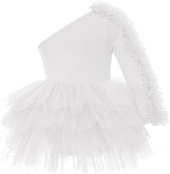 A modern one-shoulder design highlighted by soft ruffle details along the shoulder and sleeve for a sweet yet sophisticated touch.