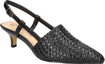 A woven vamp adds on-trend texture to this pointy-toe pump featuring an adjustable slingback strap and playful kitten heel.