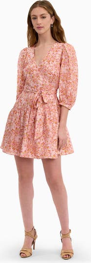 This mini dress is designed with a wrap silhouette that softly shapes the body, finished with a waist tie for a flattering fit. The asymmetrical gathered skirt adds movement, while 3/4 puff sleeves bring gentle volume. Rendered in a delicate floral print, it feels light, romantic, and effortlessly polished.