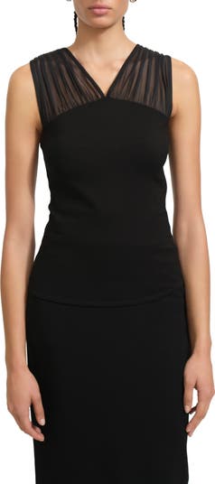 Mesh straps enhance the modern allure of a V-neck sleeveless top that's an elevated option for your next event.