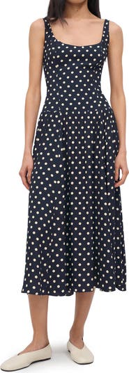 Be sweetly spotted in a polka dot dress that starts with a fitted bodice and finishes with a swirl of a skirt.