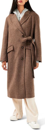 A novel side-tie adds a fresh style point to a double-breasted coat crafted in a warming wool blend.