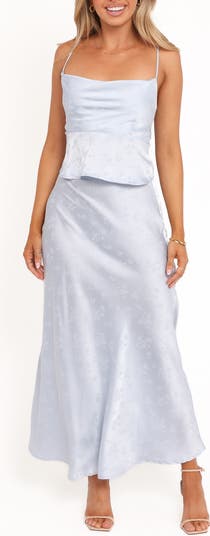 Indulge in the silky feel of this two-piece floral-satin set featuring a camisole with a lovely, subtly flared peplum and a flowy maxi skirt.