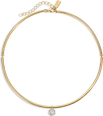 She *is* the moment. The Belle Necklace features a rigid gold collar with a single round crystal set in gold, dangling at the center.