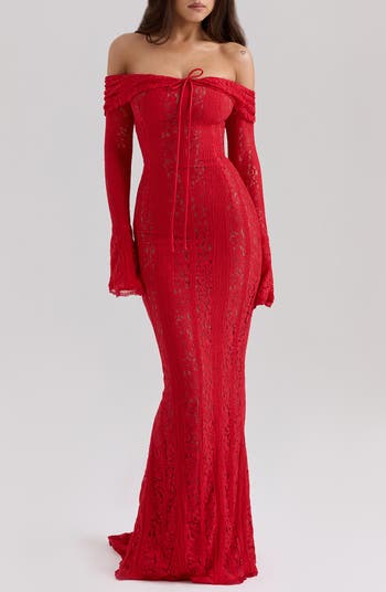 This off-the-shoulder gown is crafted from delicate stretch lace and structured with internal boning and powermesh lining to help the mermaid silhouette hug your curves in all the right places. The fluted cuffs amp up the drama, but the real showstopper? That sweeping godet skirt ending in a graceful train.