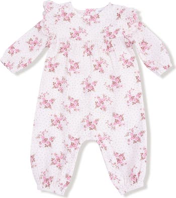 Shoulder ruffles sweeten this floral-print romper cut from organic cotton muslin for breathable comfort.