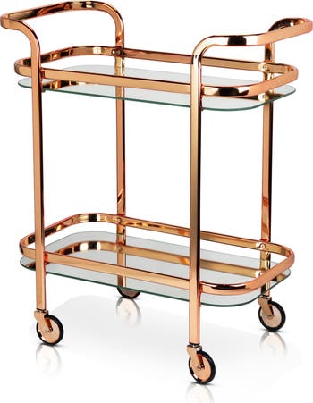Beautiful barware deserves to be displayed with decorous style. Constructed from stainless steel with a vintage gold finish, the Belmont bar cart succeeds in doing just that. Rubber-lined wheels make hosting a breeze, while dual mirror shelves reflect back the curated bar tools, stemware, and liquor that sit on each tier.