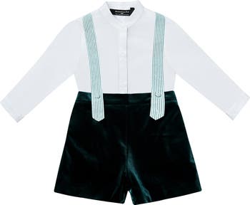 A standout choice for festive dressing, this elegant two-piece ensemble features a crisp shirt paired with rich velvet shorts and striped suspenders. The deep hue and tailored details evoke timeless charm. Button-up shirt with structured collar and clean lines. Plush velvet shorts with attached suspenders for a classic finish.