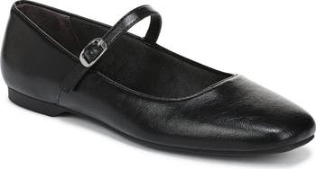 A squared-off toe adds sharp lines to a streamlined ballet flat secured with an adjustable mary jane strap and set on a cushioned footbed for daylong comfort.
