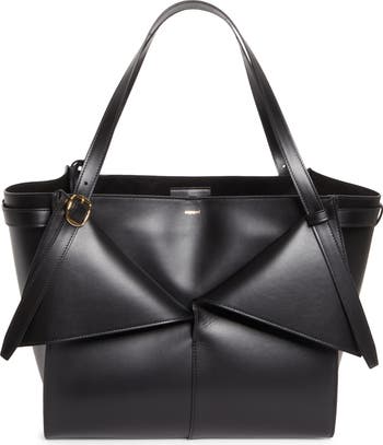 Smooth calfskin enhances the graceful origami-like design of this spacious (but not overwhelmingly so) tote set with buckle belts as shoulder straps and gusset adjusters.