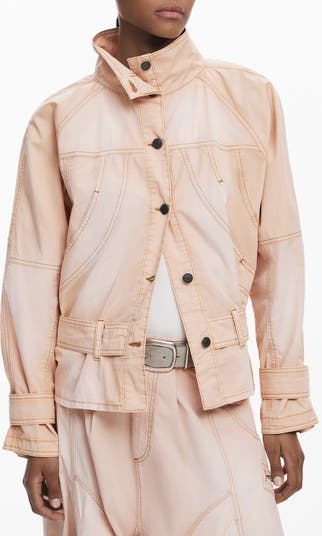 Plenty of topstitching and a cinching belt define a lightweight jacket cut from cool cotton and offered in a subtle shade.