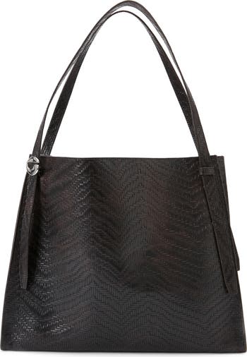 Logo buckles secure the belt-inspired shoulder straps on a slouchy tote fashioned from intricately woven Italian calfskin.
