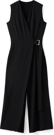 A sleeveless jumpsuit exudes sleek, modern style with a plunging crossover neckline, belted waist, and flared legs cropped just above your ankles.