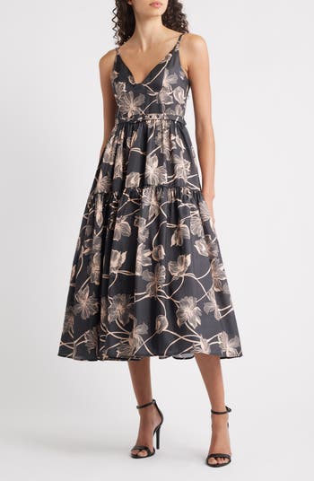 Charm from first toast to last dance in this belted satin dress that pairs a fitted bustier-inspired bodice with a flowy tiered skirt.