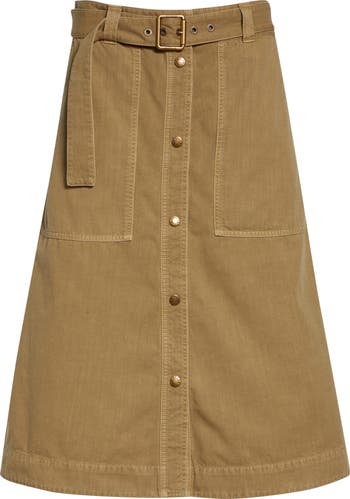 This striking A-line skirt is fastened with brass snaps and constructed with utility-style pockets, while a matching buckled belt cinches the waist. It's finished with a heavy wash, highlighting the texture of the striated, vintage-effect cotton fabrication.