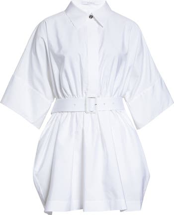 A brand-engraved top button adds eye-catching gleam to this optic-white poplin shirtdress in a rounded, oversized cut and detailed with a cinched waist and cape back yoke.