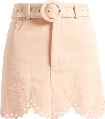 A sweetly scalloped hemline and eyelet detailing emphasize the resort-ready vibe of this cotton-twill miniskirt topped with a matching belt.