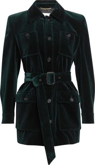 Anthony Vaccarello's designs for Saint Laurent are the perfect balance between utility and elegance, as reflected in this plush velveteen jacket dyed a deep emerald green. The safari-style profile is cinched at the waist with a belt, while a wide spread collar brings '70s nostalgia.