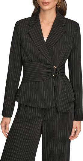 An attached belt closed with a D-ring buckle artfully appoints this sophisticated blazer covered in timeless pinstripes.