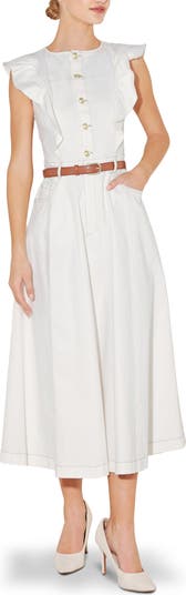 A slender belt defines the waist of this denim midi accented with fluttering bodice fills and finished with a flared skirt.