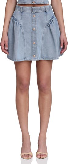 A removable belt defines the waist of this light-wash denim skirt made in a flouncy flared silhouette.