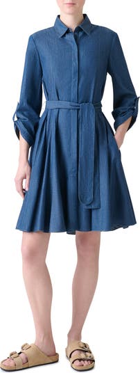 Akris Punto brings its everyday ease with a fresh, energetic spirit to this denim shirtdress featuring geometric topstitching and a playfully flared skirt. The roll-tab cuffs add a utilitarian element, while the matching tie belt deftly cinches the silhouette to define the waist.