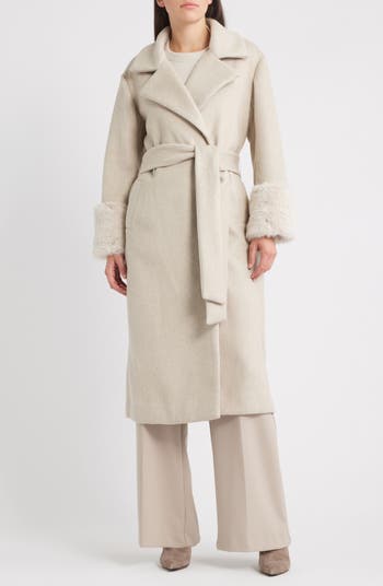 Exude glamour no matter what the weather has in store with this sharply tailored coat shaped with a silhouette-cinching belt and framed by ultraplush faux-fur cuffs.