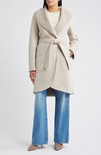 Simply styled and cozy chic, this faux-suede coat shows off the plush faux-shearling lining with a wide shawl collar and a tulip cut hemline.