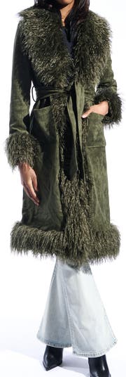 Layer up for colder weather resplendent in '70s-style glamour in this vintage-inspired belted coat cut from supple faux suede traced with ultrashaggy faux fur.