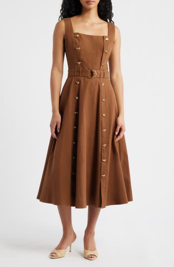 A matching belt defines the waistline of a fit-and-flare midi dress detailed with rows of polished, free-form-shaped studs to illuminate your look.